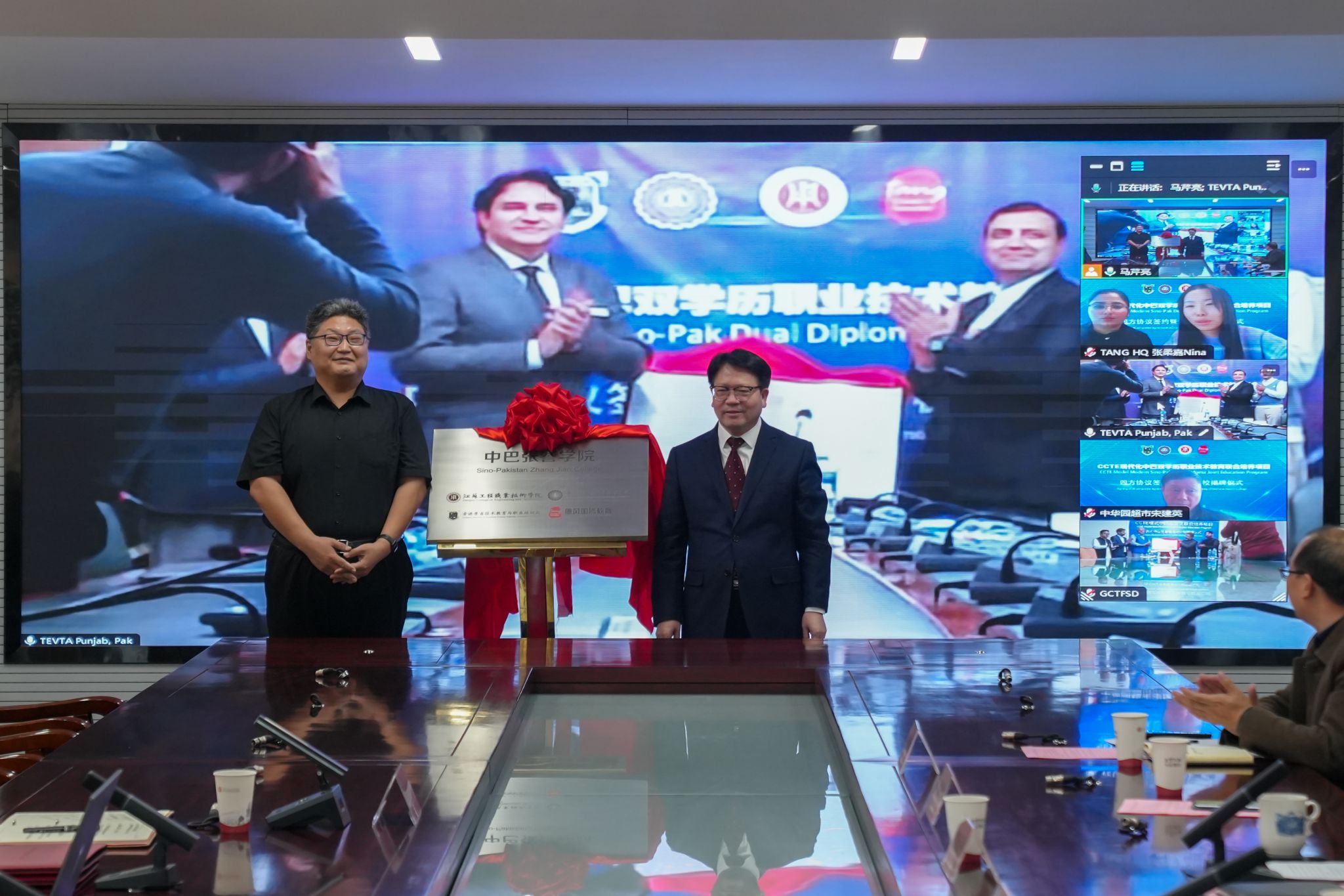 11月28日下午,我校与巴基斯坦旁遮普省职教局、费萨拉巴德省立技术大学和唐风国际教育集团相聚“云端”,举行四方合作协议签约暨中巴张謇学院揭牌仪式。巴基斯坦旁遮普省职教局总干事(学术)劳·拉希德·阿里,费萨拉巴德省立技术大学校长穆哈穆德·木纳瓦尔,唐风国际教育集团职教国际合作部总监庄雷、我校党委书记秦志林、校长陆锦军、纺织服装学院院长尹桂波、国际教育交流中心主任吉利梅、教务处副处长(主持工作)曹留峰等出席并共同见证了此次签约暨揭牌仪式。仪式由校党委副书记邓海龙主持。