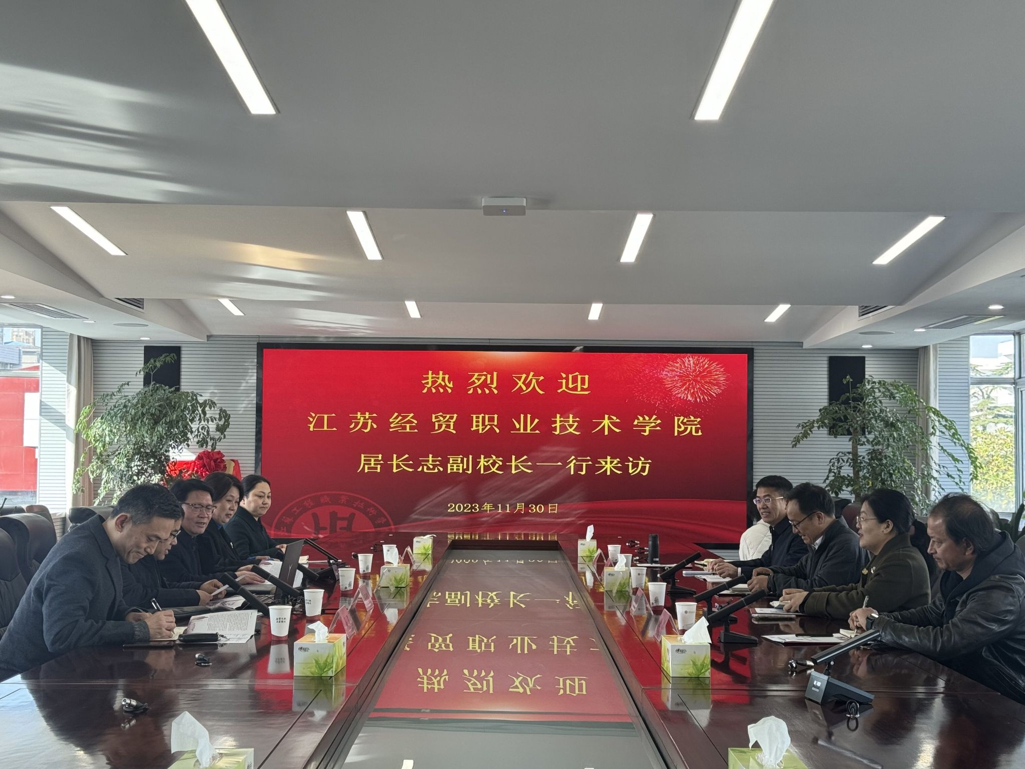 11月30日上午,江苏经贸职业技术学院副校长居长志一行5人来我校交流学习。我校党委副书记、校长陆锦军对来访表示欢迎,介绍了我校的基本情况和学校在改革发展中取得的成绩。国际教育交流中心主任吉利梅、经济管理学院院长王亚鹏、经济管理学院党总支副书记(主持工作)范晔、信息工程学院党总支副书记高飞在行政楼三楼会议室接待了来宾,并展开了热烈的研讨。