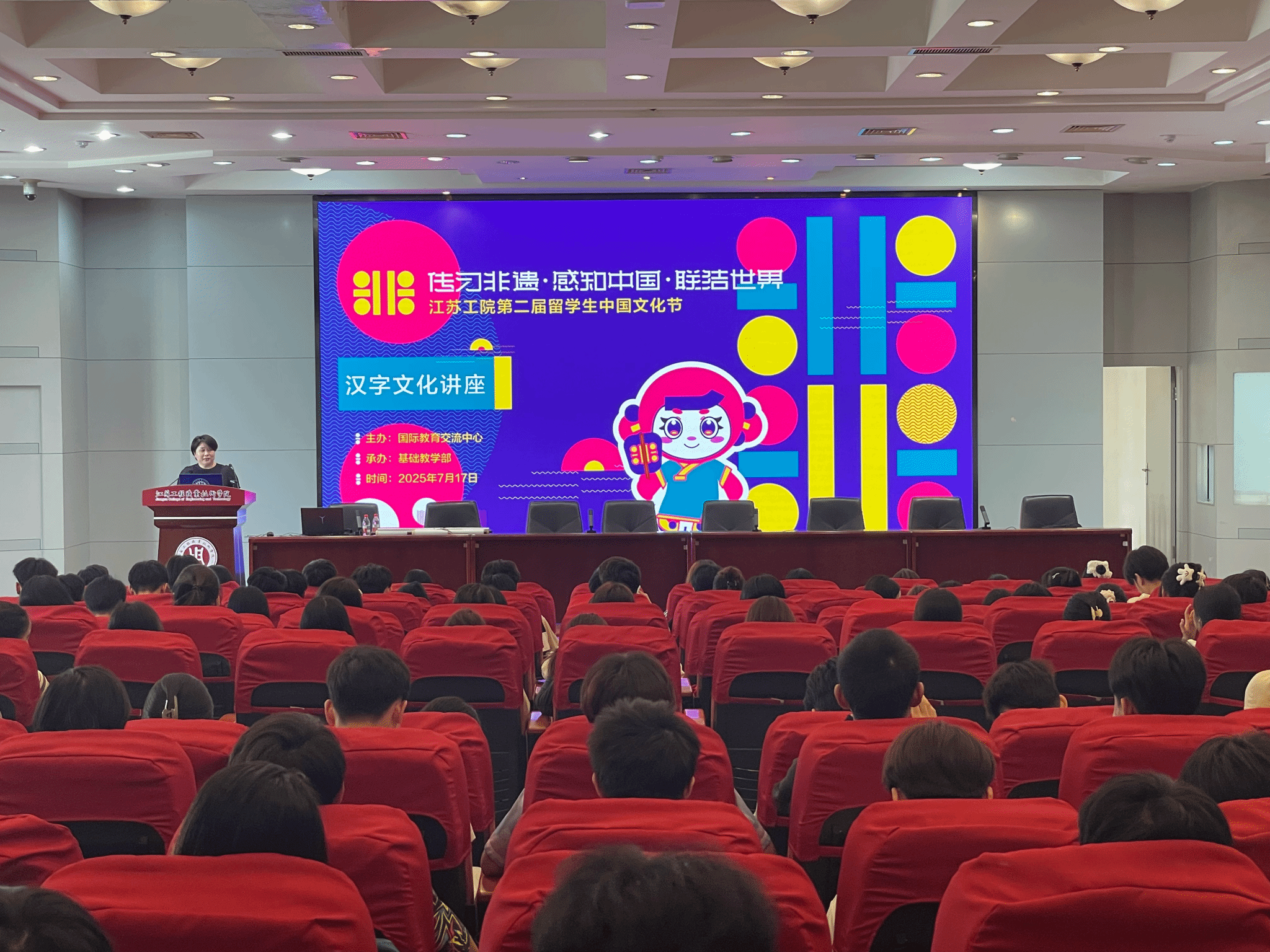 7月17日下午,由国际教育交流中心与基础教学部联合举办的第二届留学生中国文化节“翰墨千秋”系列活动——《上下五千年:从甲骨文到数字时代》汉字文化专题讲座在致知楼报告厅开讲。炎炎夏日挡不住留学生的求知热情,250余名留学生齐聚一堂,共同开启这场跨越时空的汉字文化之旅。