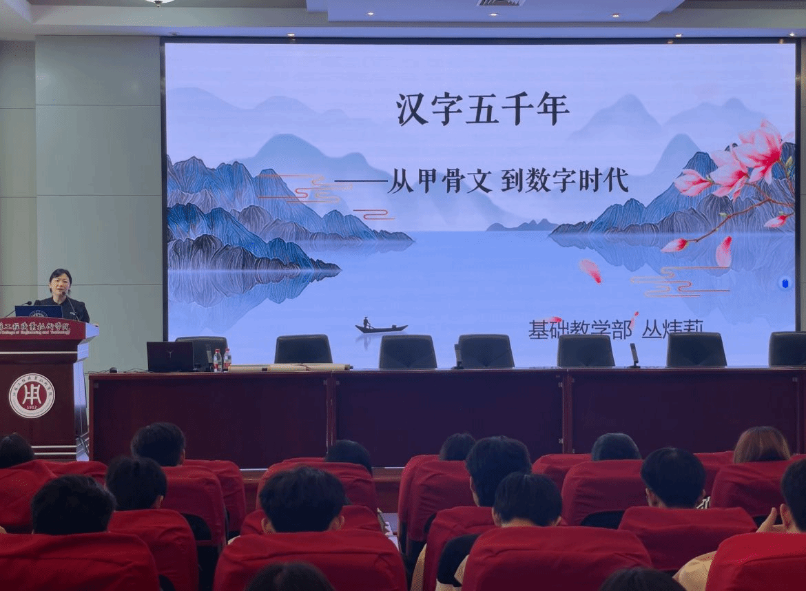 基础教学部丛炜莉副教授以深厚的学术功底,通过多媒体演示将沉睡千年的甲骨文活化再现。当“日”“月”“山”“水”等象形文字跃然屏上时,留学生们惊叹连连,纷纷举起手机记录这些穿越时空的“文明密码”。丛炜莉通过汉字字体演变的时间轴,引领留学生从甲骨文的刀刻痕迹到简牍的笔墨韵味,再到印刷术的方正之美,最后触摸数字时代的汉字新形态,在横竖撇捺间完成了一场五千年文明的沉浸式巡礼。